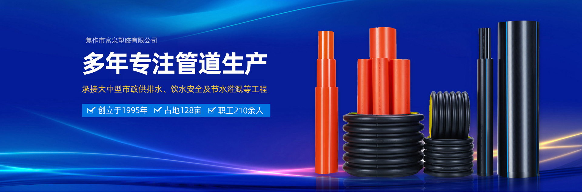 焦作市富泉塑膠有限公司,創立于1995年,是一家集研發、設計、生產、銷售為一體的大型管材企業。公司位于太極故里、黃河之濱一一河南焦作溫縣。公司占地128畝,現有職工210余人,其中具有中技術職稱的19人。生產、檢驗設備58臺(套),包括PVC實壁管生產線11套、PE實壁管生產線12套、HDPE雙壁波紋管生產線6套、PVC雙壁波紋管生產線5套,檢驗設備14臺(套)。主要產品有:Φ20mm-630mm、各種壓力規格的PVCU、PVC-M、PE給水管材,PVC-U節水灌溉管材,HDPE燃氣和礦用管材,DN200-800mm的HDPE、PVC雙壁波紋管及各種噴灌、滴灌工程材料。承接大中型市政供排水、飲水安全及節水灌溉等工程。  富泉塑膠公司重視產品的質量、安全、環保和節能,在同行業中率先完成了“新華節水產品認證”,全方面通過OHSAS18001職業健康安全管理體系的一體化導入,并建立起規范的現代企業管理體系。公司以“質量”為先導,采用質量跟蹤、多環節把關的方法,組建具有行業水準的企業技術檢測中心,常年委托水利部節水灌溉設備檢測中心、河南省產品質量監督檢驗院對產品跟蹤檢測,并由中國人民保險公司承保產品質量。公司連續多年被河南省水利廳確定為“安全飲水設備、節水灌溉設備”定點生產企業,并獲得“中國名優產品”“質量、服務、信譽AAA企業”“河南省**產品”“河南省水利企業”“河南省守合同、重信用企業”等榮譽稱號。  富泉塑膠公司堅持“用戶為上”的服務理念,長期以來,全方面關注客戶價值,不斷提升服務水平。服務隊伍常年為客戶的產品設計、施工、安裝提供合理的方案和全程細致、周到、**、快捷的技術服務。公司自成立以來,一直堅持以人為本的宗旨,塑造企業形象,并致力于新產品的開發,憑借雄厚的技術開發能力,先進的工藝制造流程,嚴格的質量管理保證體系,優良的售后服務網絡,已成為河南省大的飲水、灌溉及排水管材設備制造商。產品暢銷全國,而且還以公司雄厚的綜合實力在業界中占據著重要的地位。